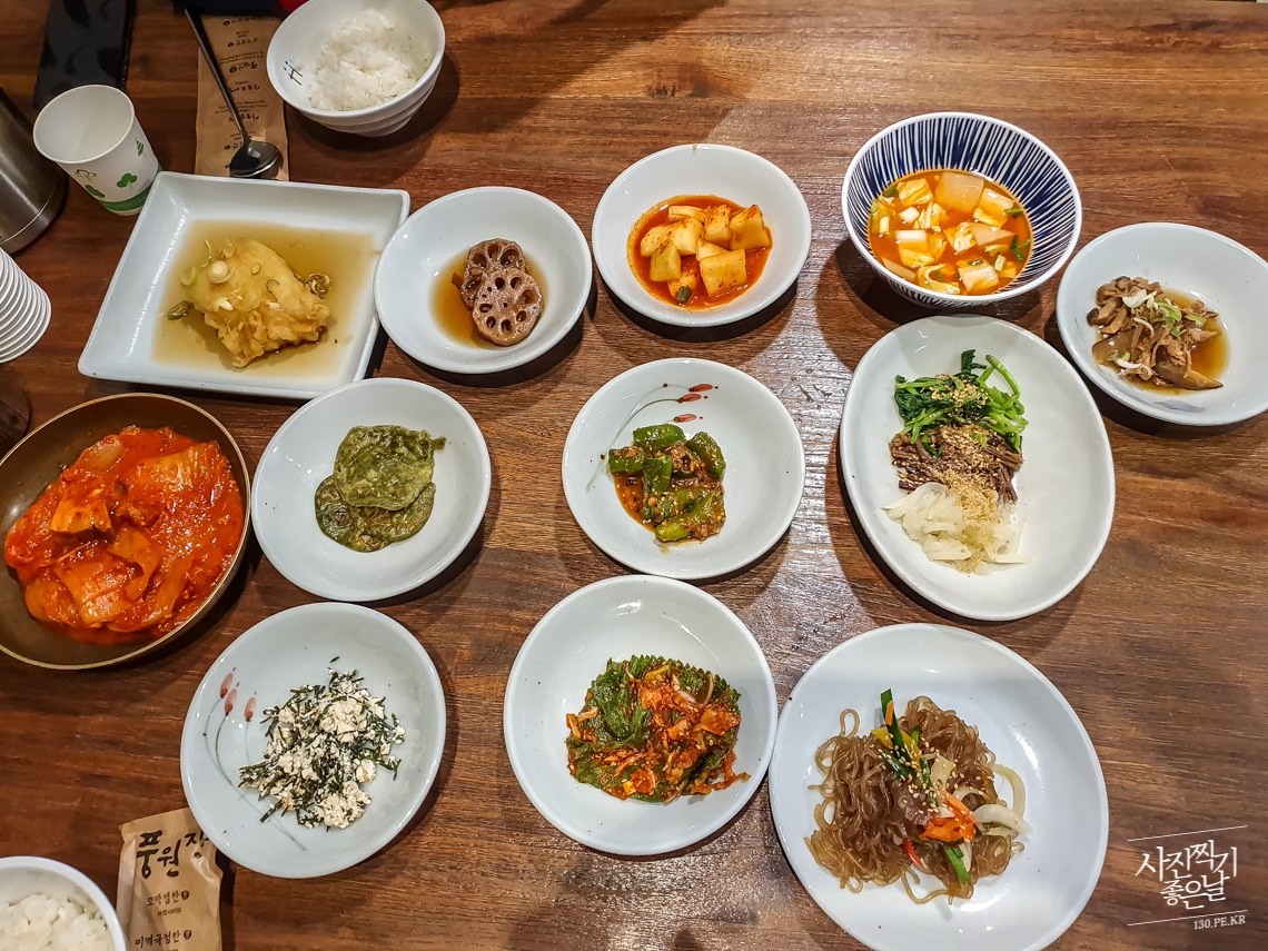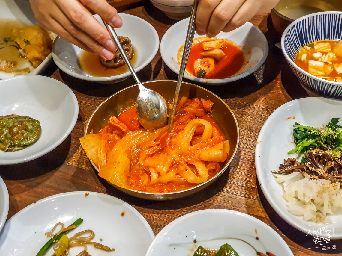๋ฉ๋ดํ์ ์จ ์๋ ์๊ธ๊ณผ ๋ค๊นจ๊ฐ๋ฃจ๊ฐ ํ ์ด๋ธ๋ง๋ค ๋์ฌ ์์ต๋๋ค.