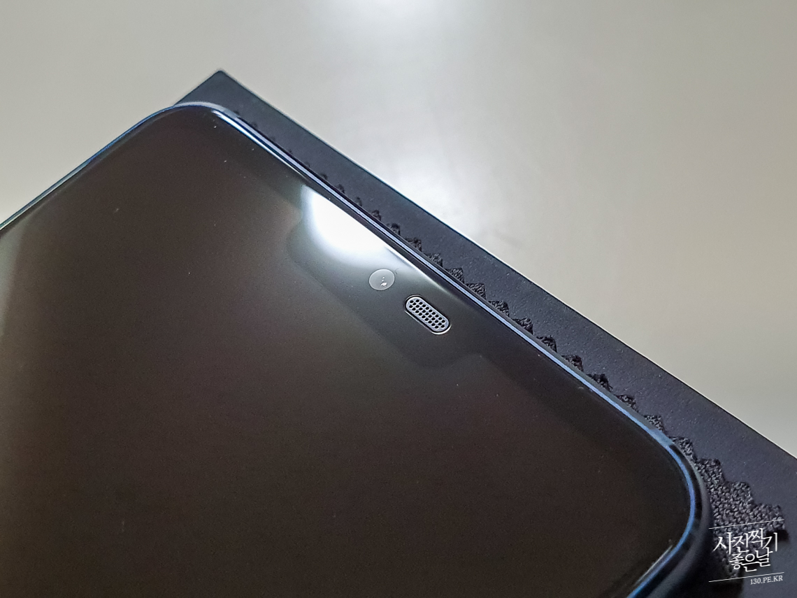 ์ƒ๋‹จ์€ ๋…ธ์น˜ ๋””์ž์ธ. ์ „๋ฉด ์นด๋ฉ”๋ผ์™€ ํ†ตํ™”์šฉ ์Šคํ”ผ์ปค๊ฐ€ ๋‹ฌ๋ ค์žˆ์Šต๋‹ˆ๋‹ค.