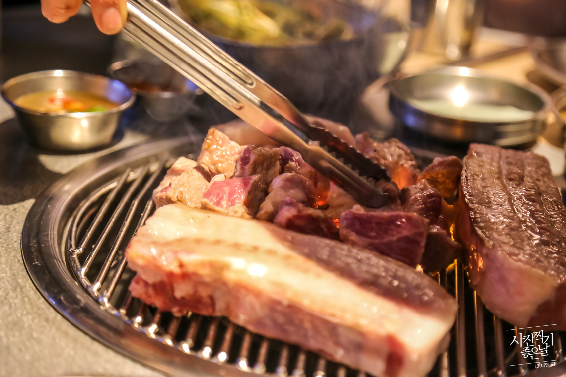 ๋ฉ์ธ์ธ ๊ณ ๊ธฐ ๋ฉ๋ด๋ ์์ ๋ฐ๋ผ 2์ธ๊ณผ 3์ธ, ๊ณ ๊ธฐ ์ถ๊ฐ๋ง ๋ฑ ์๊ตฌ์. ๊ณ ๊ธฐ๋ ๋ชฉ์ด๊ณผ ํ๋ผ์ง ์ค๊ฒน์ด์ด ๋ฉ์ธ์ ๋๋ค.