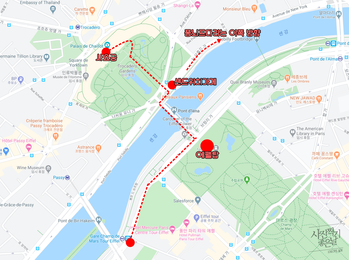 ์ฌ์ ๊ถ์ ๊ฐ๊ธฐ ์ํด ์ํ ํ ์์์ ๋๋ก๋ฅผ ๊ฑด๋ ์ผ ๊ฐ์ ๊ฐ๋ก์ง๋ฅด๋ ๋ค๋ฆฌ๋ฅผ ๊ฑด๋๋ค. ๋ค๋ฆฌ ์ด๋ฆ์ Pont d'Iéna ๊ตฌ๊ธ๋๊ป ๋ฌผ์ด๋ณด๋ ์ด์๋ ๋ค๋ฆฌ๋๋ค.