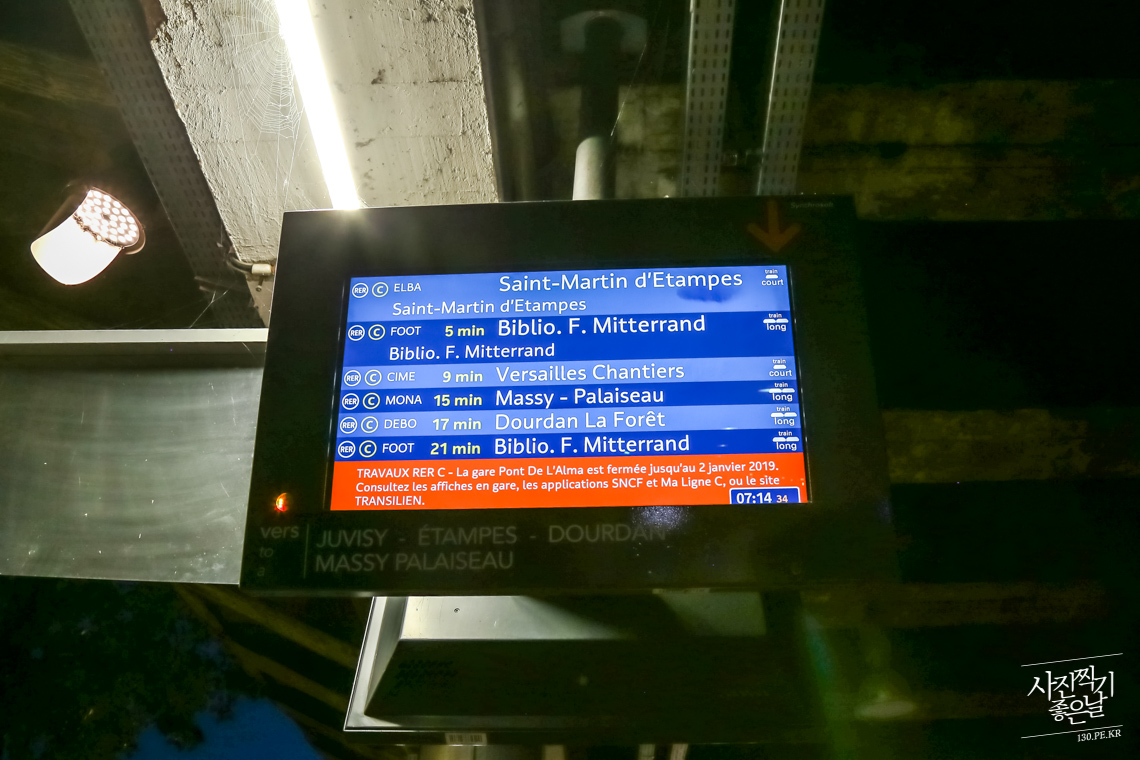 ์ ์ฒ ์ ํ๊ณ 1์๊ฐ ๋จ์ง ๊ฑธ๋ฆฐ๋ค. ์ฐ๋ฆฌ๋ ์ ์ฒ RER C ๋ผ์ธ์ ํ๊ณ Pont de l'Alma์ญ์์ ํ ๋ฒ ํ์นํด์ผ ํ๋ค.