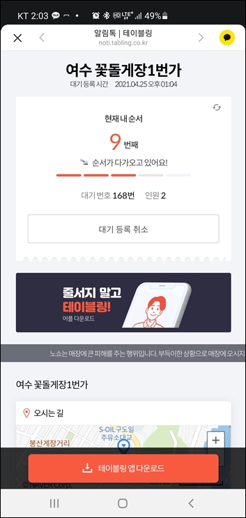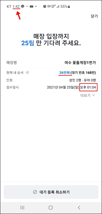 이 캡쳐는 식당주차장에 도착했을 때 찍은 겁니다. 1:04분에 접수하고 식당에 도착해서 42분이 되었는데도 아직 25팀이 대기하고 있었습니다. 그래서 식당 오는 중간에 주유소도 들러서 주유하고 여유있게 왔는데도 아직 많이 남았네요. 미리 대기접수 하지 않고 왔다면 얼마나 오래기다렸을지;;