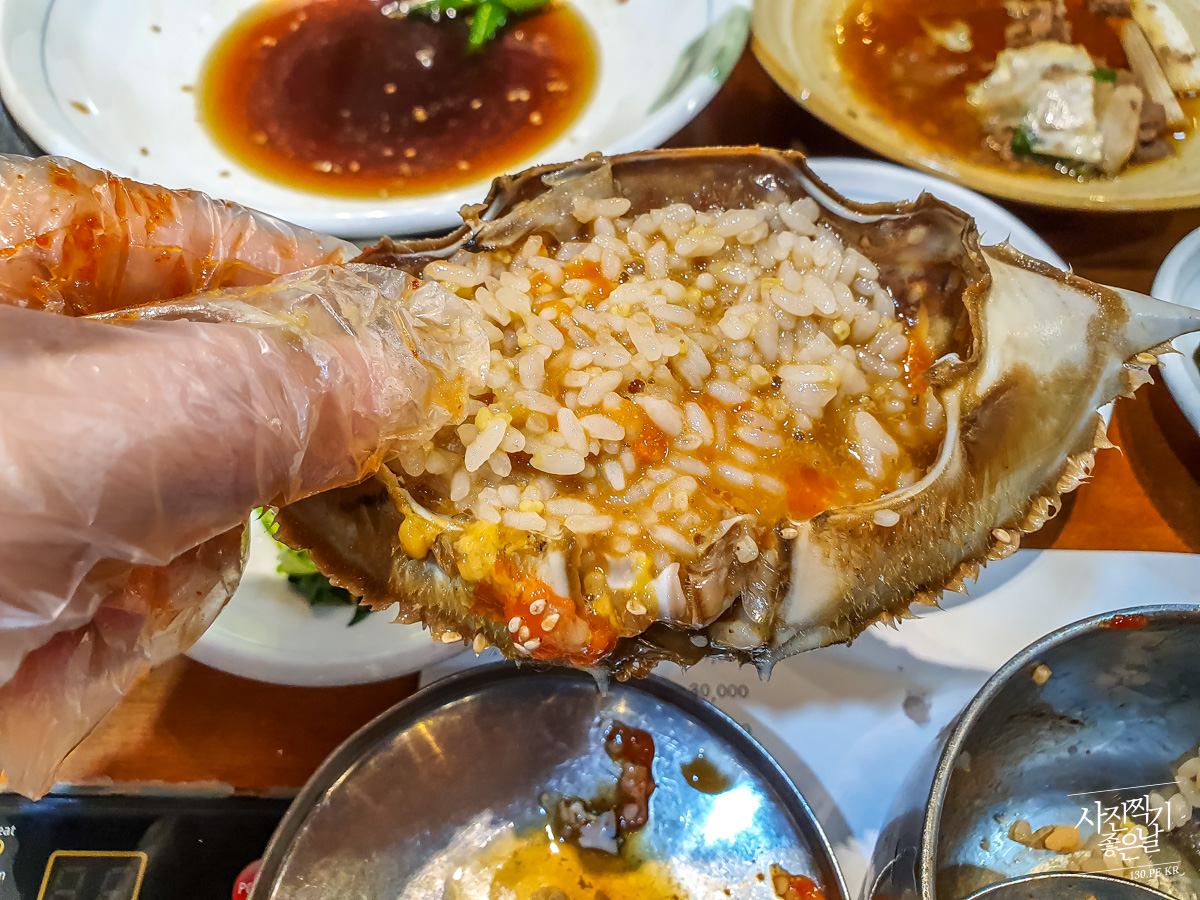 게장을 먹고 아쉬운대로 게딱지에 밥을 비벼먹습니다. 양념국물이 짜지 않아서 그대로 퍼먹어도 될 정도.