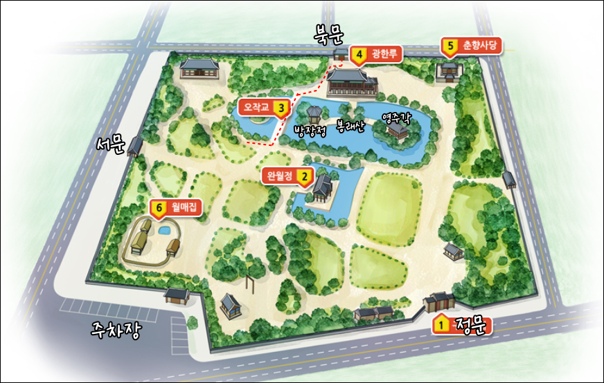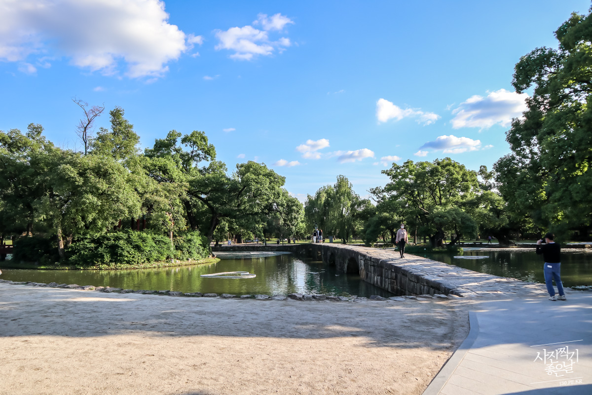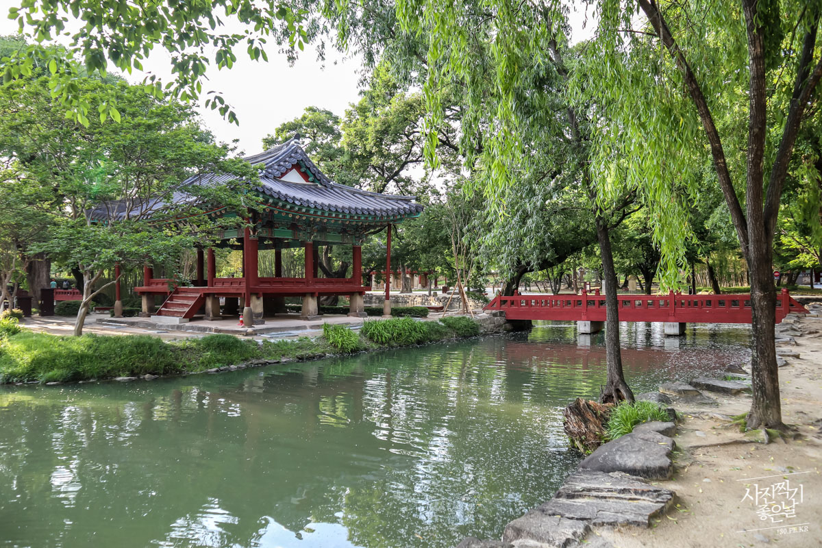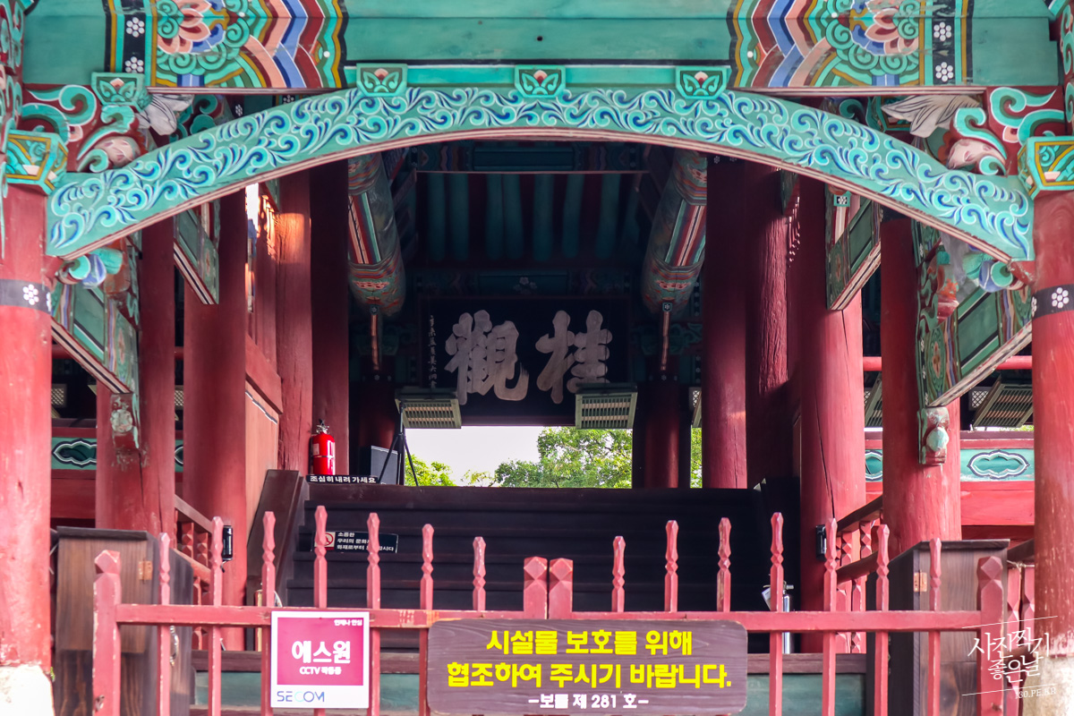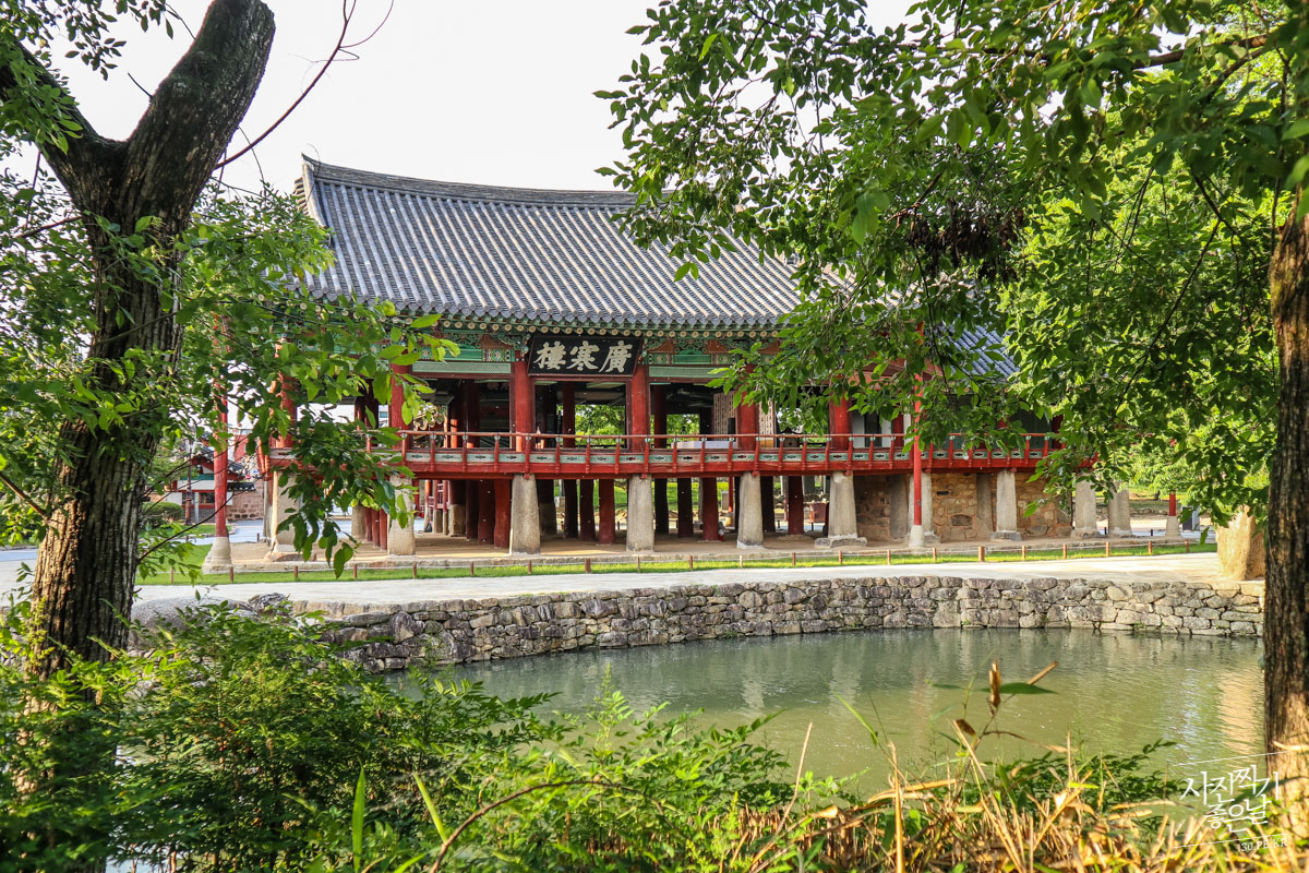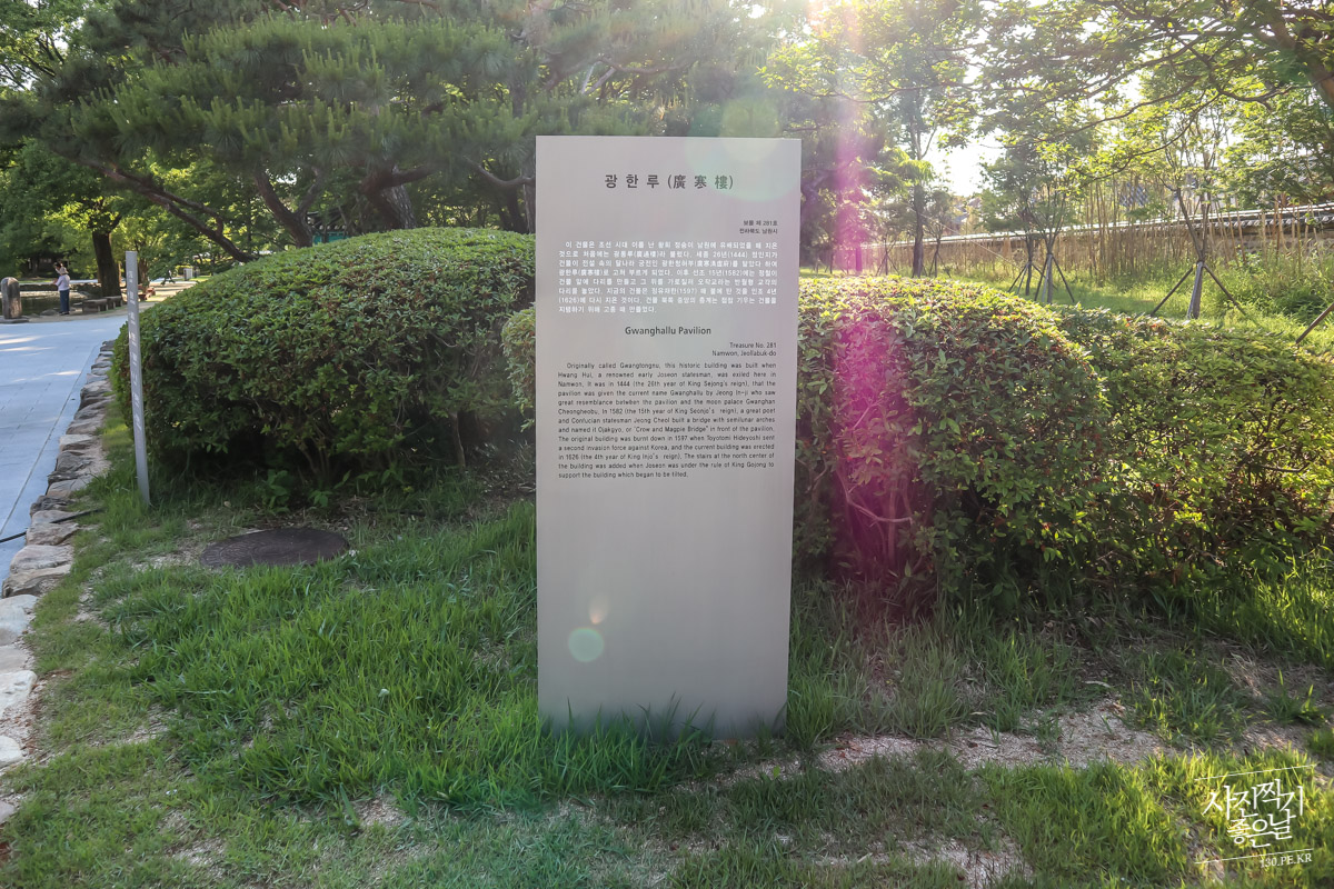 ์ด ๊ฑด๋ฌผ์ ์กฐ์ ์๋ ์ด๋ฆ ๋ ํฉํฌ ์ ์น์ด ๋จ์์ ์ ๋ฐฐ๋์์ ๋ ์ง์ ๊ฒ์ผ๋ก ์ฒ์์๋ ๊ดํต๋ฃจ๋ผ ๋ถ๋ ๋ค. ์ธ์ข 26๋ (1444) ์ ์ธ์ง๊ฐ ๊ฑด๋ฌผ์ด ์ ์ค ์์ ๋ฌ๋๋ผ ๊ถ์ ์ธ ๊ดํ์ฒญํ๋ถ๋ฅผ ๋ฎ์๋ค ํ์ฌ ๊ดํ๋ฃจ๋ก ๊ณ ์ณ ๋ถ๋ฅด๊ฒ ๋์๋ค. ์ดํ ์ ์กฐ 15๋ (1582)์๋ ์ ์ฒ ์ด ๊ฑด๋ฌผ ์์ ๋ค๋ฆฌ๋ฅผ ๋ง๋ค๊ณ ๊ทธ ์๋ฅผ ๊ฐ๋ก์ง๋ฌ ์ค์๊ต๋ผ๋ ๋ฐ์ํ ๊ต๊ฐ์ ๋ค๋ฆฌ๋ฅผ ๋์๋ค. ์ง๊ธ์ ๊ฑด๋ฌผ์ ์ ์ ์ฌ๋(1597) ๋ ๋ถ์ ํ ๊ฒ์ ์ธ์กฐ 4๋ (1626)์ ๋ค์ ์ง์ ๊ฒ์ด๋ค. ๊ฑด๋ฌผ ๋ถ์ชฝ ์ค์์ ์ธต๊ณ๋ ์ ์ ๊ธฐ์ฐ๋ ๊ฑด๋ฌผ์ ์งํฑํ๊ธฐ ์ํด ๊ณ ์ข ๋ ๋ง๋ค์๋ค.