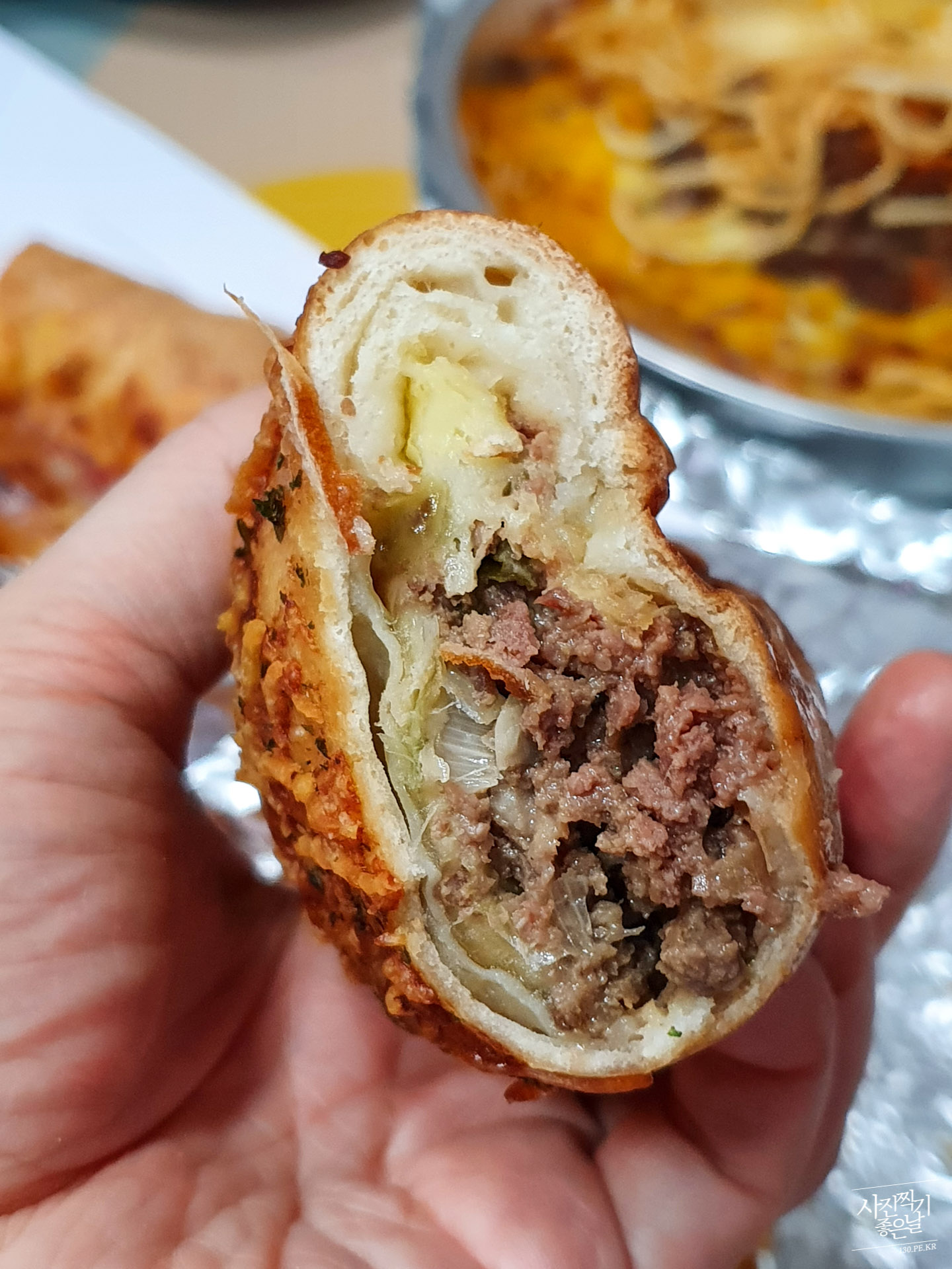 ์์ด ์์ฐจ๊ฒ ๊ฝ๊ฝ ๋ค์ด์๊ณ ๊ฐ์ฅ์๋ฆฌ ๋ํผํ ๋ถ๋ถ์ ์น์ฆ๊ฐ ๋ค์ด์๋๋ฐ ํ ์ดํฌ์์ํด์๋ค๋ฉด ์ ์๋ ์ง์ ์ด์ง ๋๋ ค ์น์ฆ๋ฅผ ๋ง๋๋ง๋ํ๊ฒ ํด์ ๋จน๋๊ฑธ ์ถ์ฒํฉ๋๋ค. ๊ทธ๋ฅ ๋จน์๋๋ ์ข ๋ป๋ปํด์ ๋๋ ค ๋จน์๋๋ ์น์ฆ๊ฐ ํ๋ฌ ๋์ ๊ฟ๋ง~