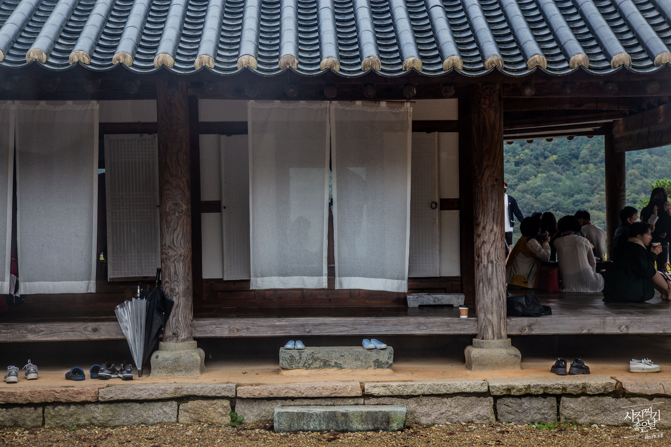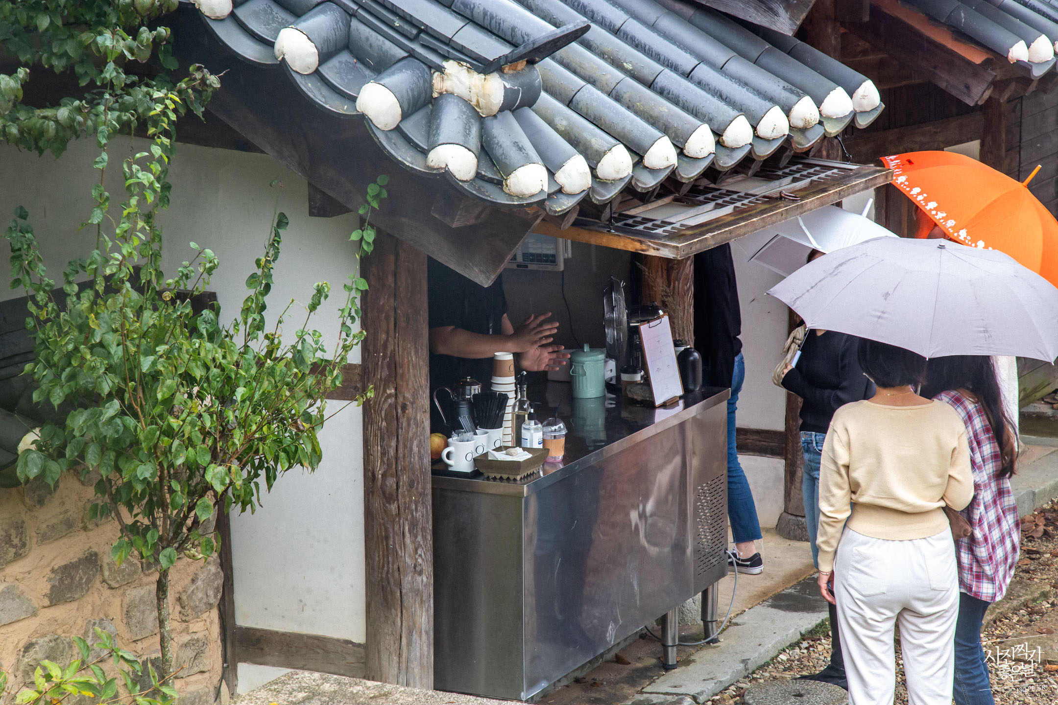 ํ๋์ ๊ฑด๋ฌผ์ ๋์ ๋ด๋ ค์ค๋ฉด ํ์ฅ๋ค์ด ๋ณด์ ๋๋ค. ์ฌ๋๋ค์ด ํ๋ง๋ฃจ์ ์๋ฆฌ ์ก๊ณ ์์์ ์ปคํผ๋ฅผ ๋ง์๊ณ ์๋ค์.