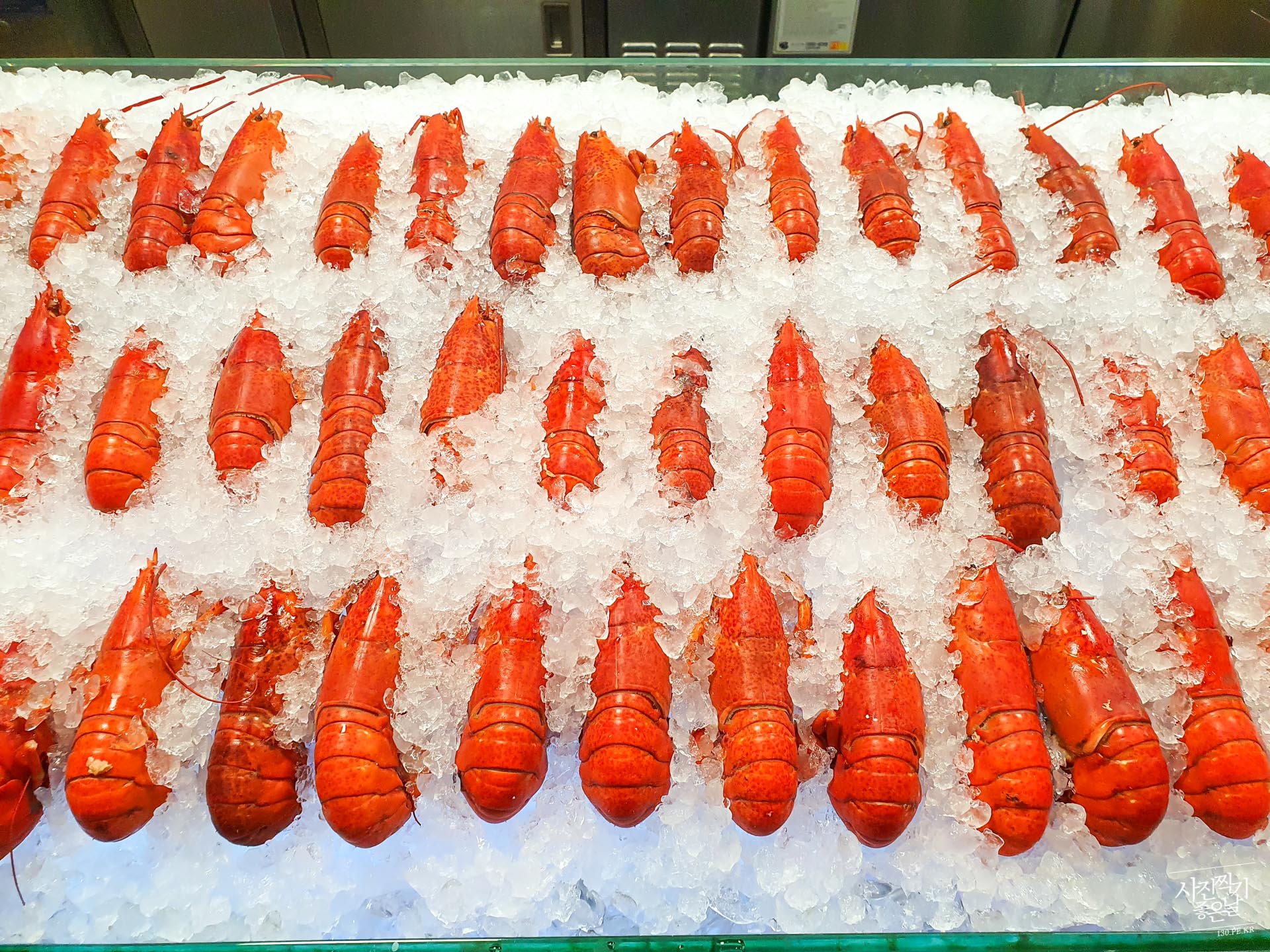 랍스터가 얼음 속에 가지런히 묻혀있습니다.