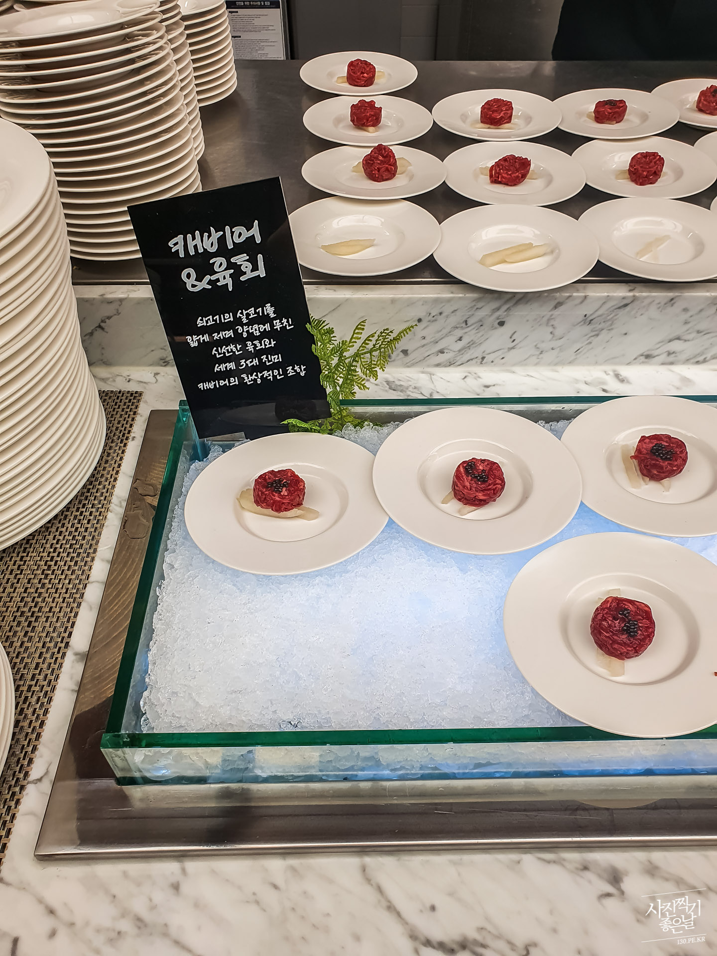 바이킹스 워프 육회는 이렇게 한 접시씩 담아서 캐비어를 올려서 내놓습니다.