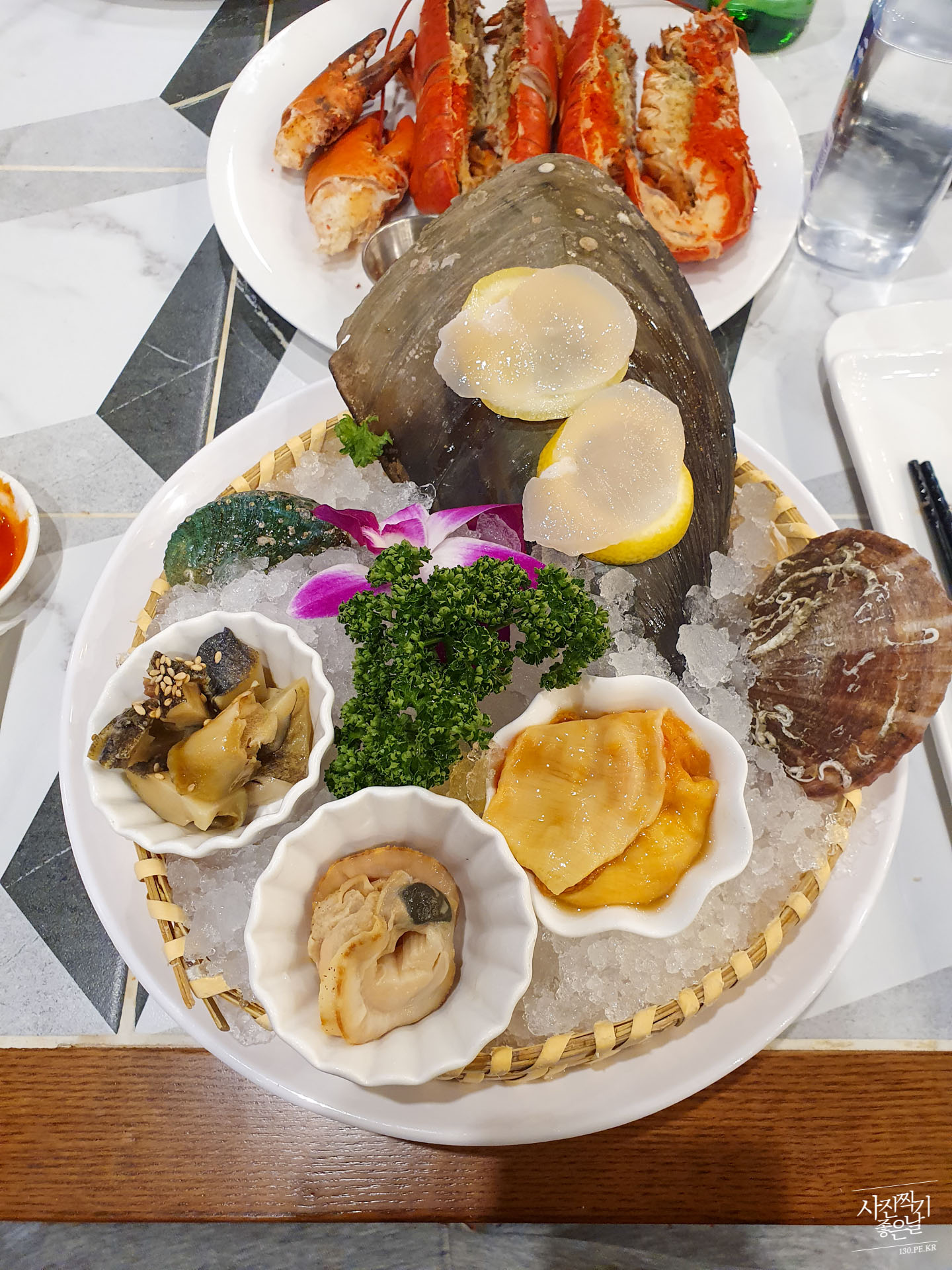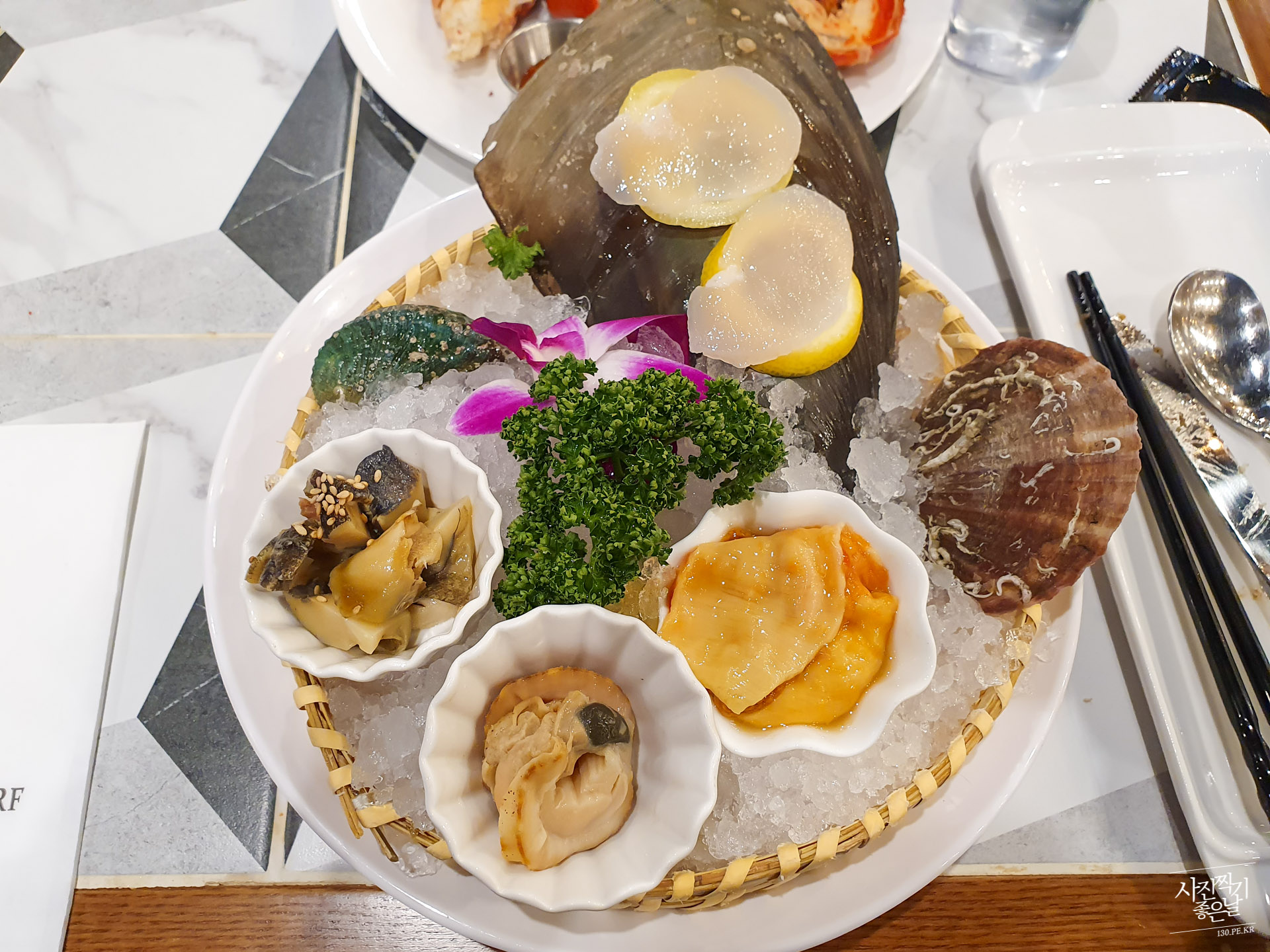 여직원이 저랑 똑같이 주문했다길래 봤는데 제가 받은 거랑 같은 걸 보니 저 참소라같이 생긴 게 북방대합조개인가 봐요. 플레이팅은 그때그때 조금씩 달라집니다.