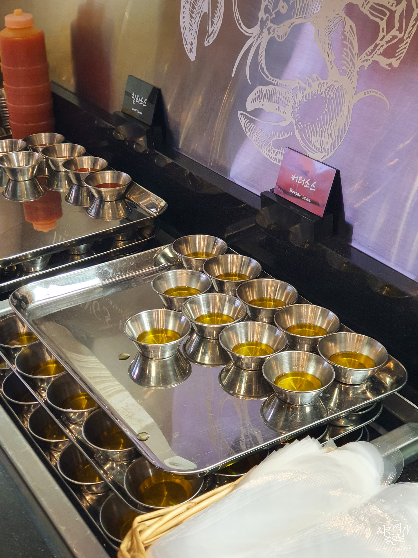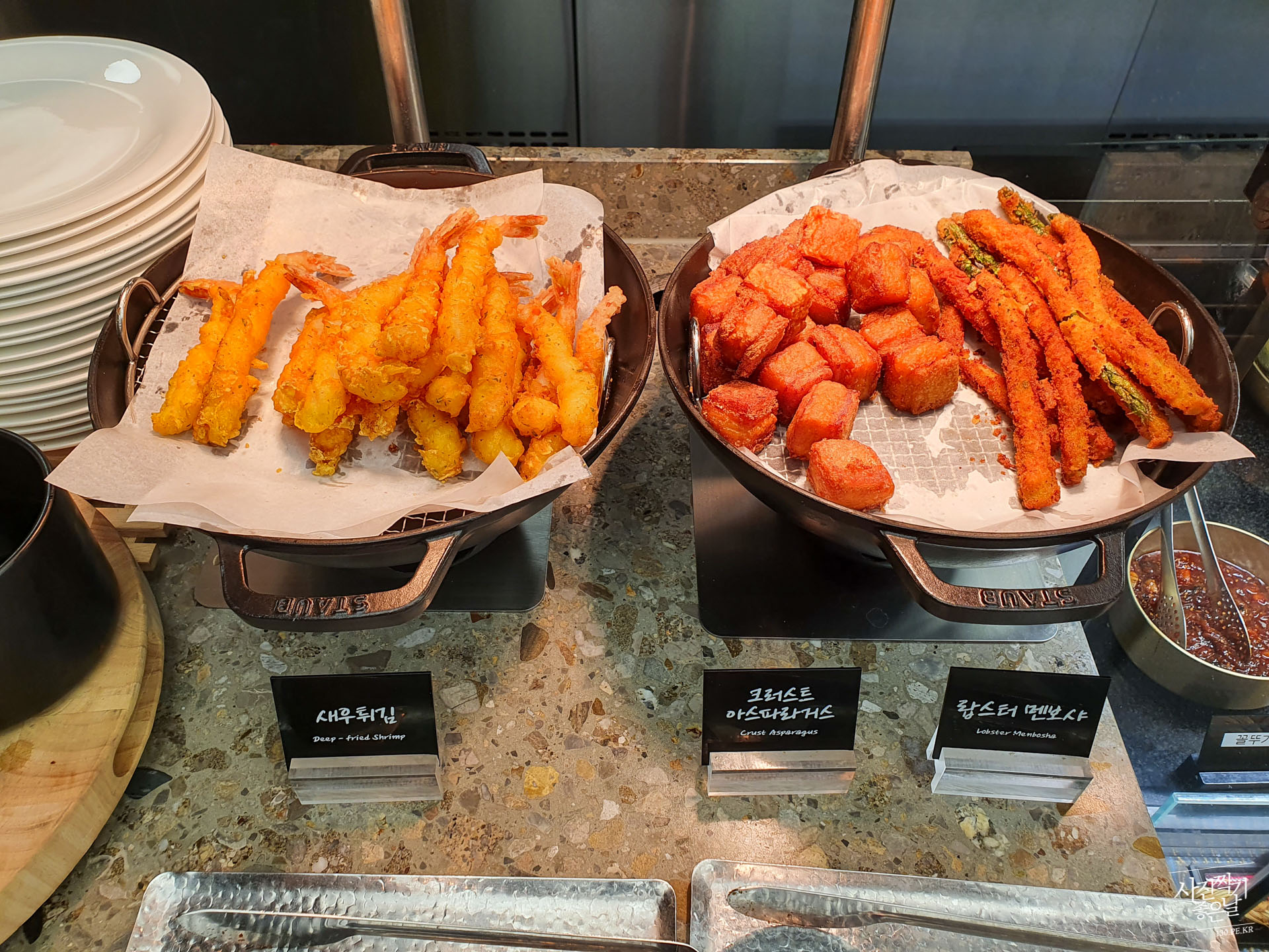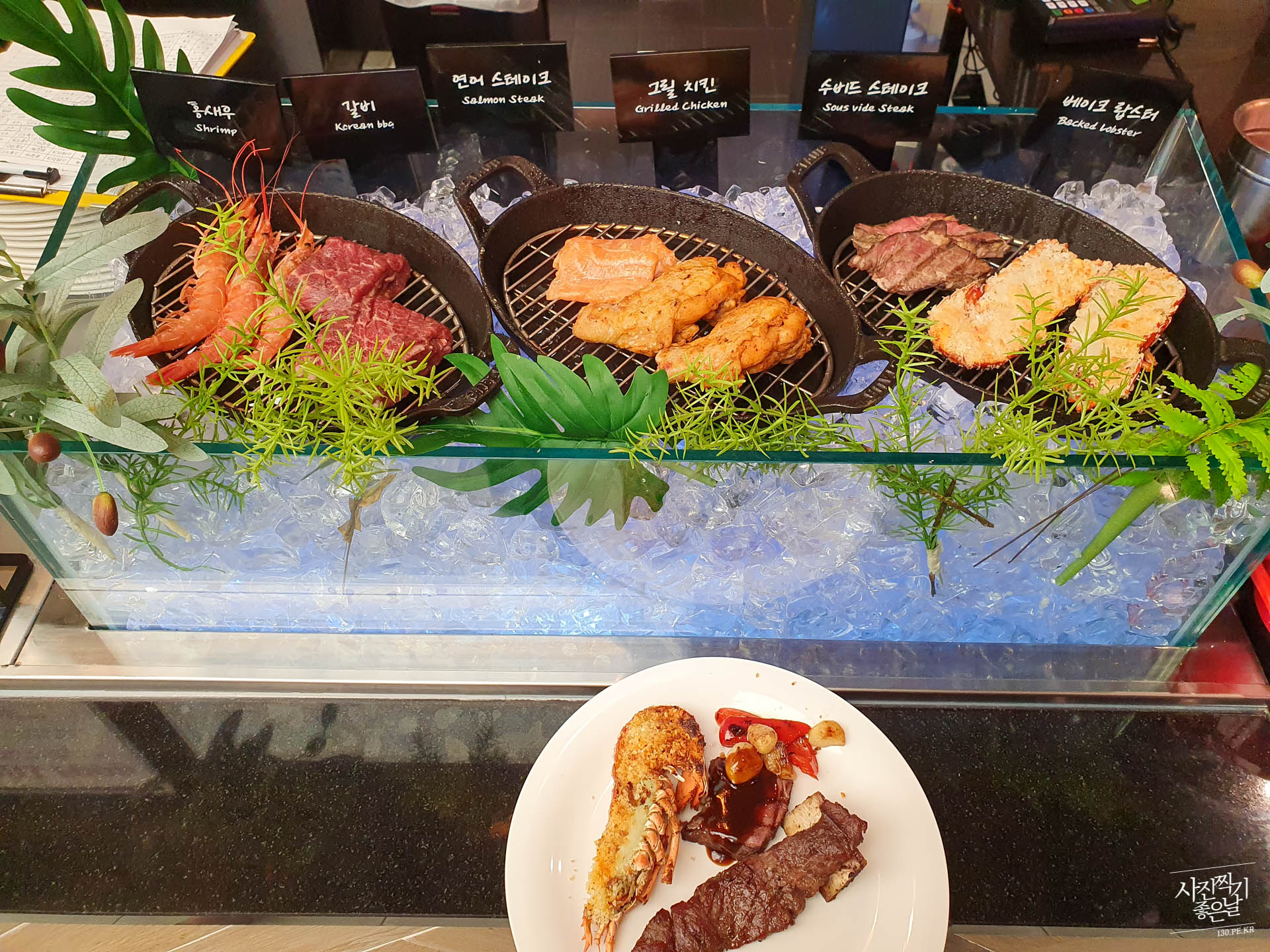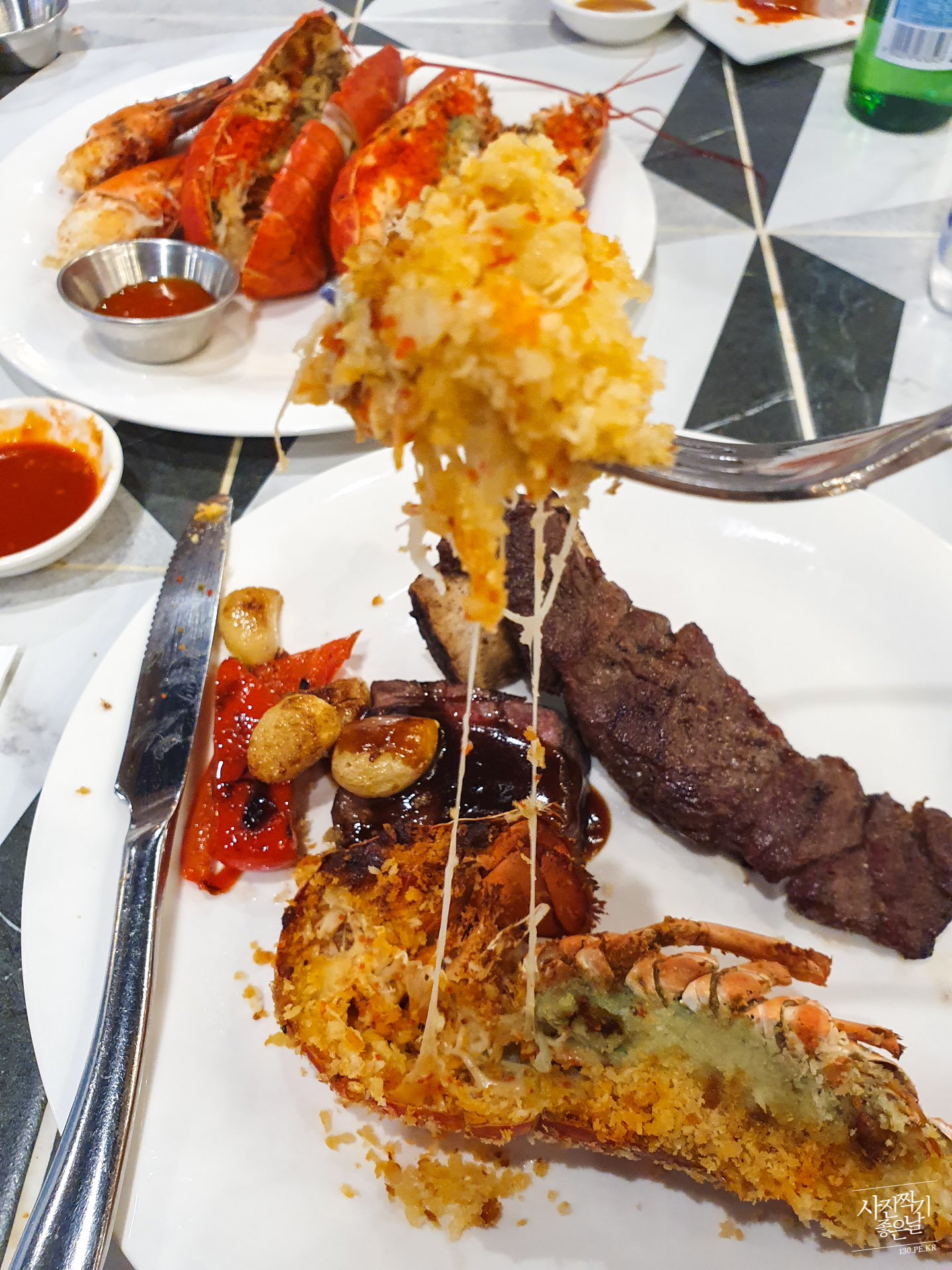 줄이 길고 오픈 초라 랍스터가 빨리빨리 나오지 않아서 줄을 서면 기본 5분 정도는 기다렸고 그마저도 랍스터가 떨어져서 다시 나오는 데까지 몇십 분의 시간이 걸렸습니다. 이게 실망 포인트 1이고 두 번째는 한쪽 룸에 사장으로 보이는 사람의 지인들이랄까 한 팀의 손님이 있었는데 다른 손님들이 랍스터 기다리면서 줄을 서 있는데도 랍스터가 나오면 그 지인들한테 먼저 서빙을 하더군요. 더구나 셀프로 가져가는 것도 아니고 다른 직원들이 접시에 담아서 나르더라는... 지인 손님 대접하려면 영업시간 이외에 하던가 다른 손님들 방해되지 않게 하던가 해야 하는데 뭐 이런데가 있나 싶더군요.