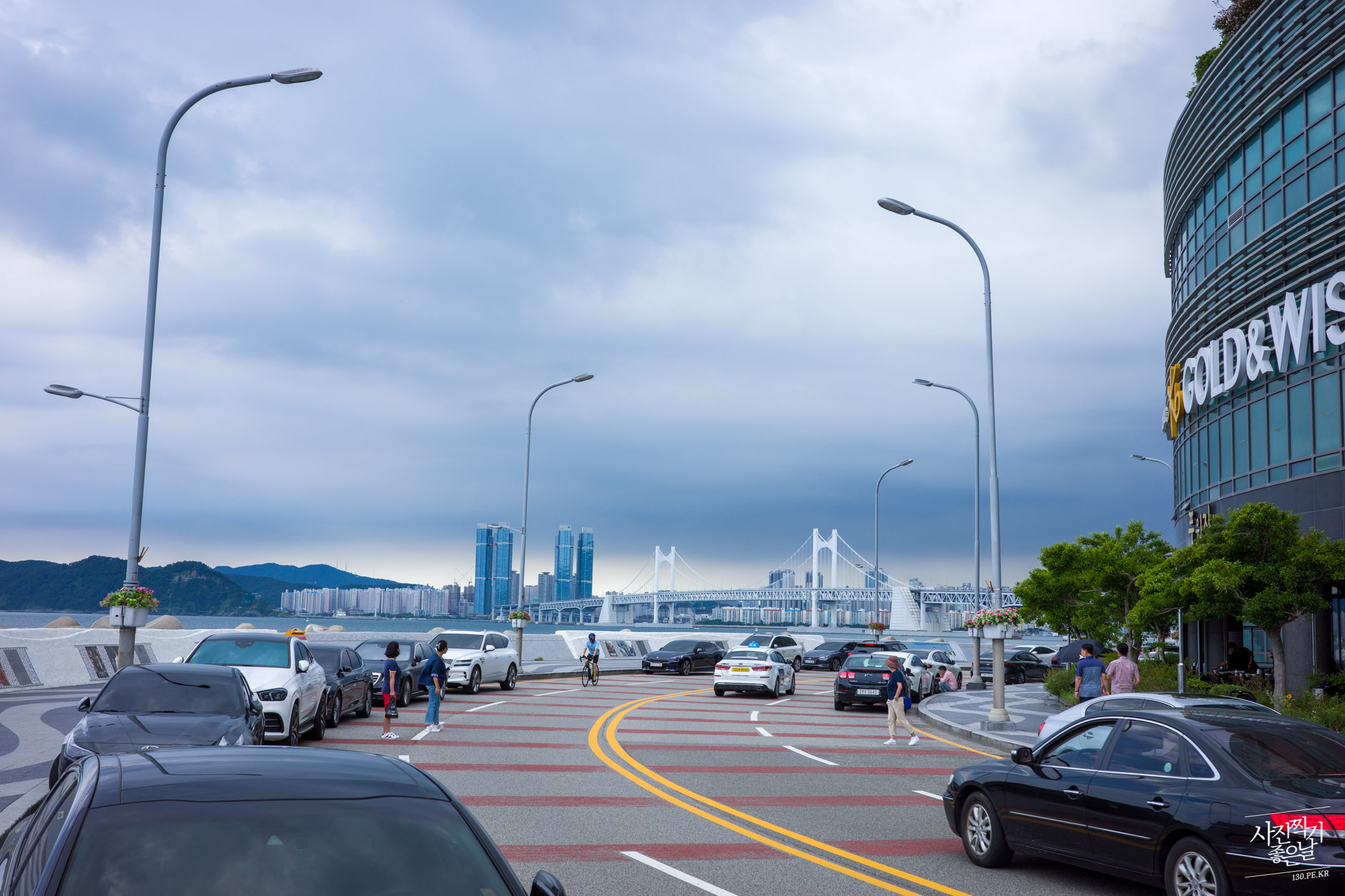 ์ ๋ฉ๋ฆฌ ๊ด์๋๊ต๊ฐ ๋ณด์ด์ฃ . ํด์ด๋ ๋ง๋ฆฐ์ํฐ์์ ๋๋ฐฑ์ฌ์ด ๋ณด์ด๋ ๋ฐ๋ท๊ฐ ์์ ์์ต๋๋ค.
